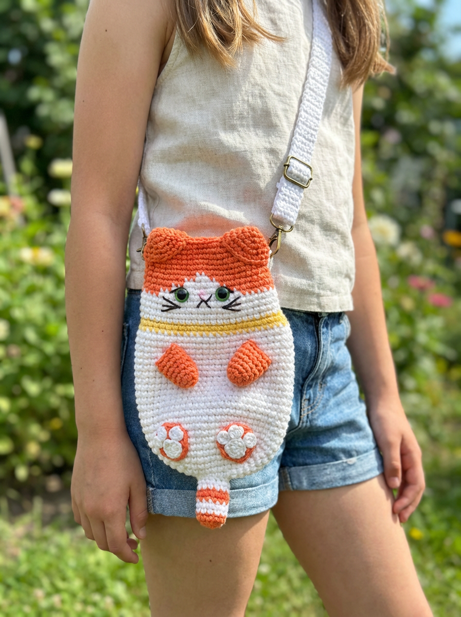 Handmade crochet cat-shaped crossbody bag
