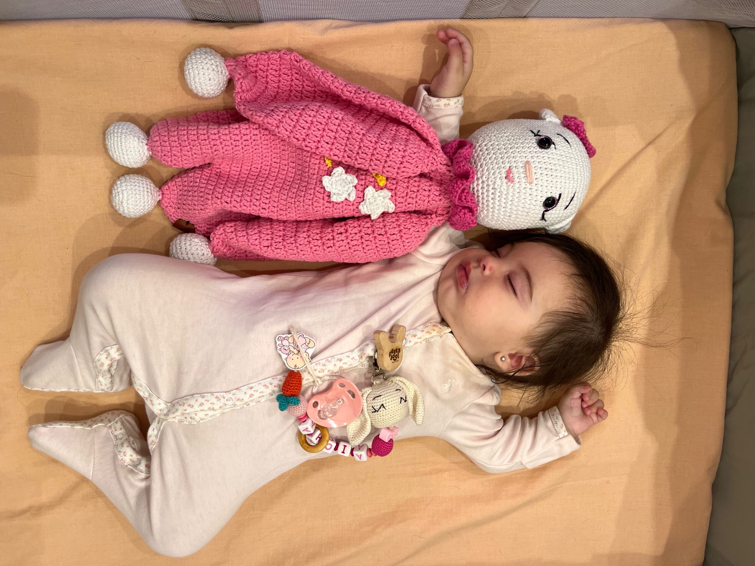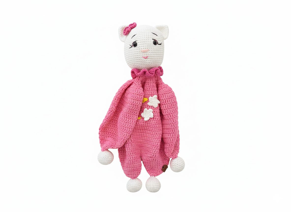 Designed as a snuggly sleep companion, Mitten combines comfort and sensory reassurance: a smooth crochet texture, lightweight body, and charming sleepy face that feels safe and friendly. The adorable pink sleepy outfit and delicate flower details make it a beautiful nursery piece and a thoughtful gift for baby showers, newborn welcomes, and first birthdays.
