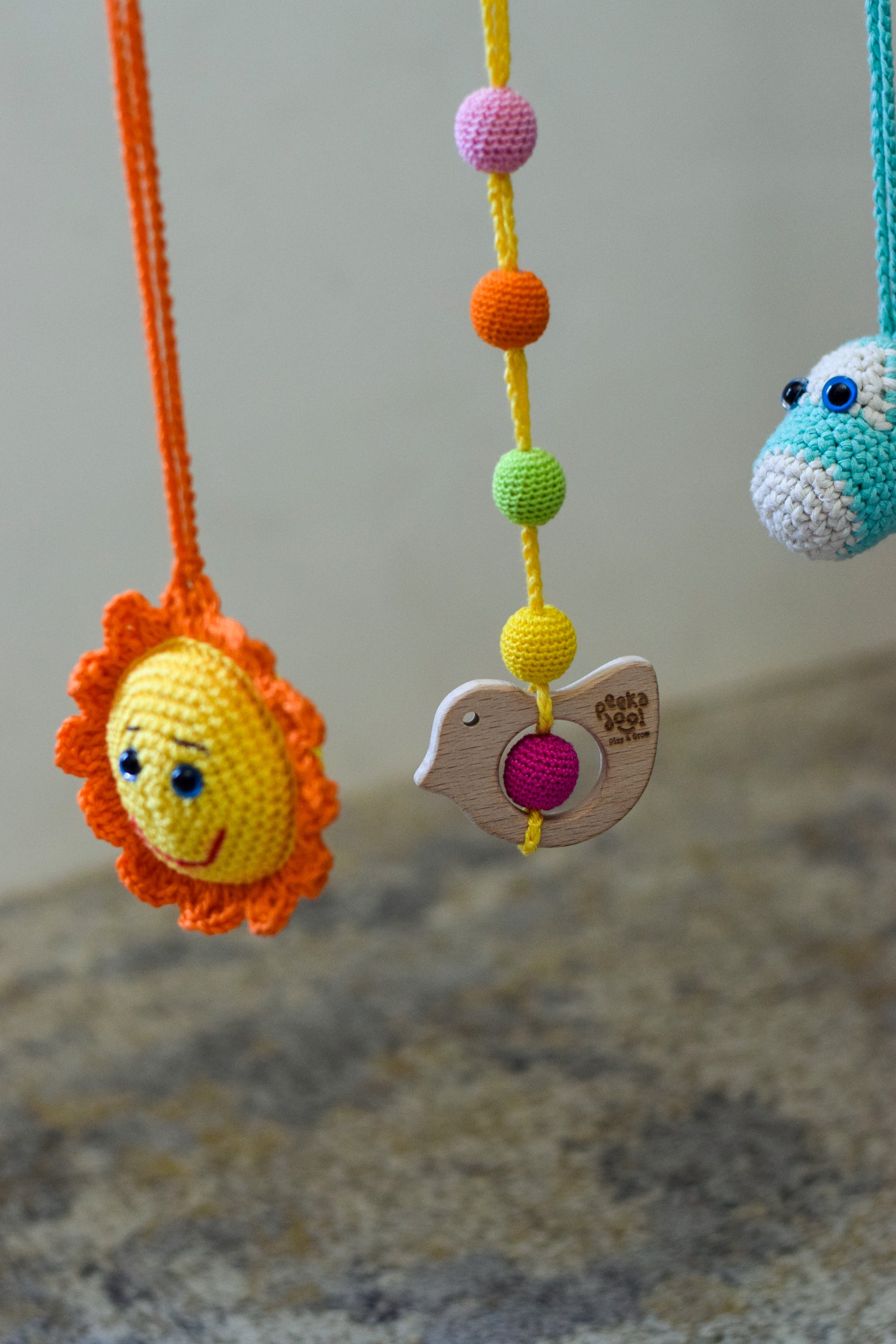 Our Baby Gym with Crocheted Toys is a developmental haven for your baby. Featuring dangling handmade toys crafted with natural yarns, this play gym promotes hand-eye coordination, reaching, grasping, and visual tracking.